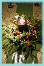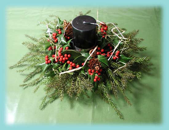 ご近所からいただいたクリスマスホーリーの枝と山で採ってきた木で作りました。 今年は、太いキャンドルが主流なのでしょうか? 売っているのも、それが多かったような気がしました。 黒のキャンドルってのも、いいかな?