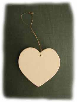 厚さ4ミリの板を木工ミシンでハート形にカット。水性ペンキで白くペイントし、穴を開けてゴールドのヒモを通しただけのシンプルなものです。これを100個作りました。