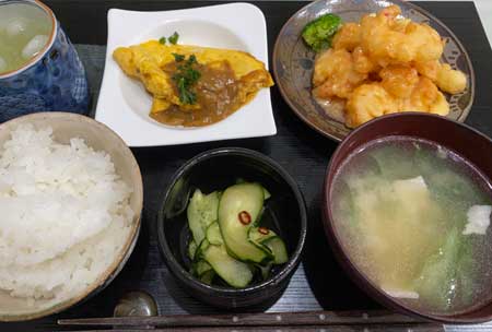 今日のお昼ご飯です。 ⚫️エビとイカの天ぷら ブロッコリー チリマヨソースで ⚫カレー入りオムレツ パセリ 昨夜のカレーを 中に入れて焼きました。 ⚫️スライスきゅうりのポン酢あえ ポン酢と砂糖と生姜を 混ぜた中に浸しておきました。 ⚫️味噌汁 ベーコン・九条ネギ